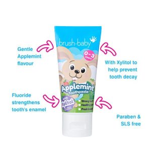 Brush-baby infant and toddler toothpaste is perfect for your little one because it tastes great! Just use a smear on your children’s toothbrush and you’re ready to go! It is safe for little one as our children’s toothpaste is safe for kids as it’s SLS FREE, meaning it’s non foaming and is suitable for vegans and vegetarians! Our kids toothpaste also contains Xylitol which reduces sugar acids and fluoride which strengthens milk teeth enamel.