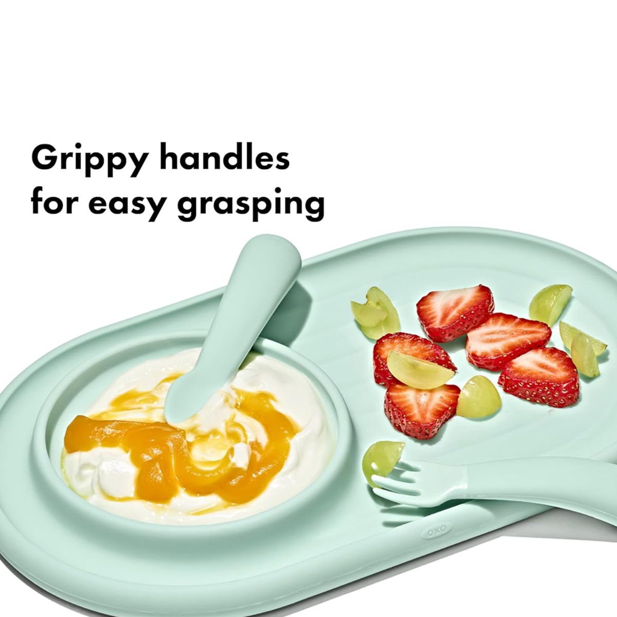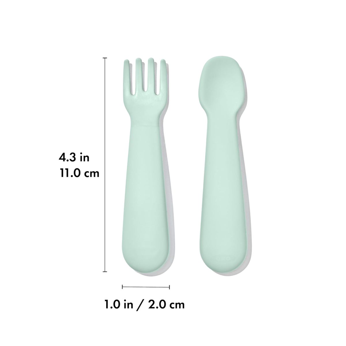 OXO Tot Mini Fork & Spoon Set are true baby essentials — complete with an easy-to-use fork and shallow baby feeding spoon. Our toddler fork and spoon set guides self-feeding for your little one. OXO Tot baby feeding essentials consist of a silicone baby feeding set, which is a must-have in baby led weaning supplies. Our toddler silverware, kids utensils, and baby utensils, was designed to fit just right into your baby’s grasp. The handles are carefully curved to encourage secure placement as your little one progresses with baby led weaning and practices using baby spoons for self-feeding.