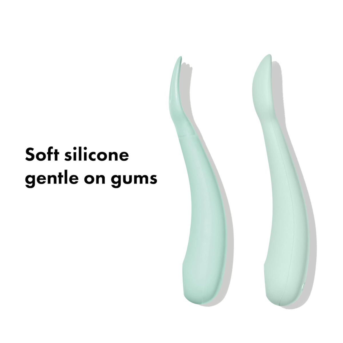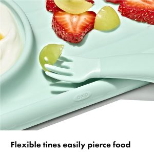 Toddler silverware can be firm — OXO Tot’s baby feeding set provides a comfy alternative with a toddler fork and spoon set that picks up food without being sharp. The shallow baby spoon travel utensils provide comfort and baby spoons fun. These kids utensils are made with soft silicone baby friendly material that soothes even the most sensitive gums.