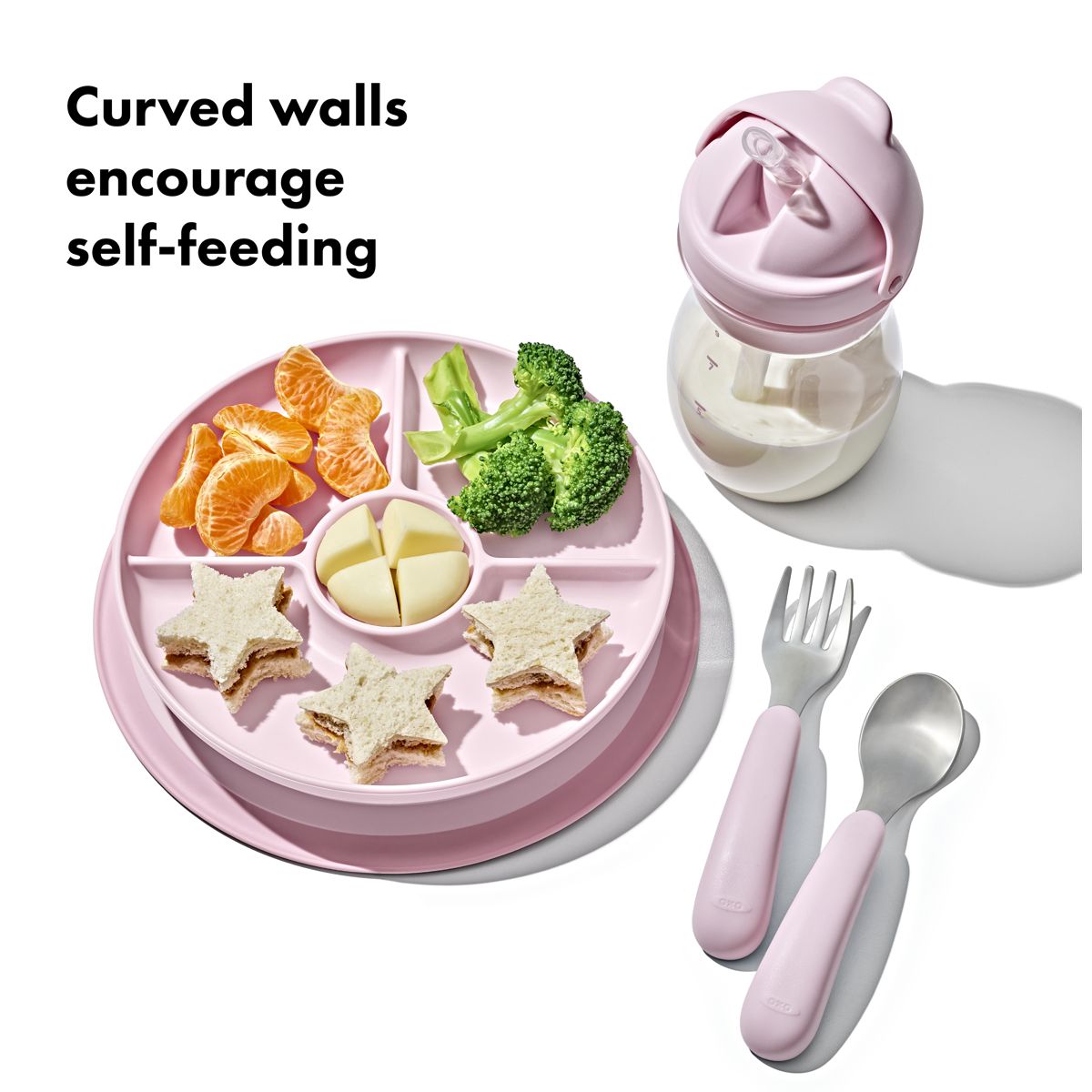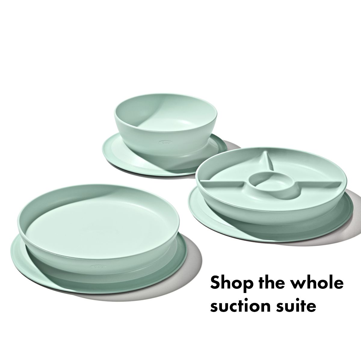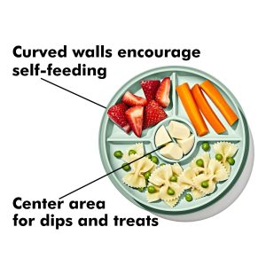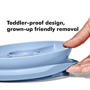 The OXO Tot Stick and Stay Divided Plate features a secure suction base that sticks firmly to surfaces until mealtime is over. The parent-friendly design makes these plates and bowls easy for grown-ups to remove, but tricky for little ones, to prevent slipping, tipping or tossing. The side walls are designed to help tots with scooping to help promote self-feeding. These dishwasher safe bowls and plates quickly twist apart for thorough cleaning.